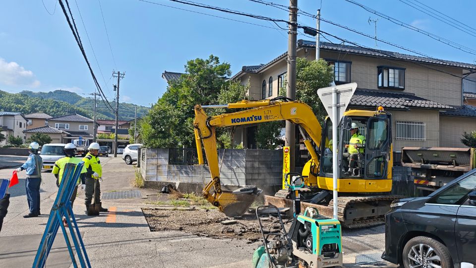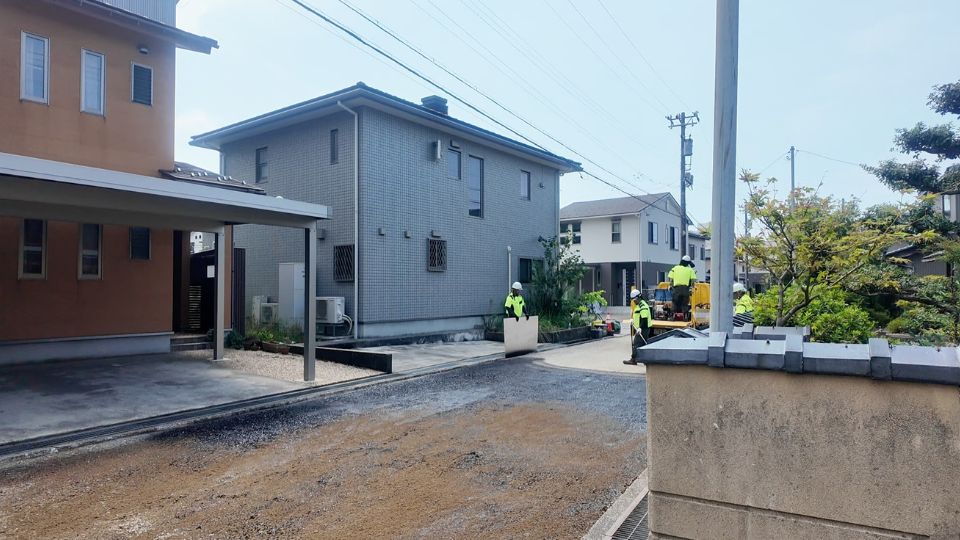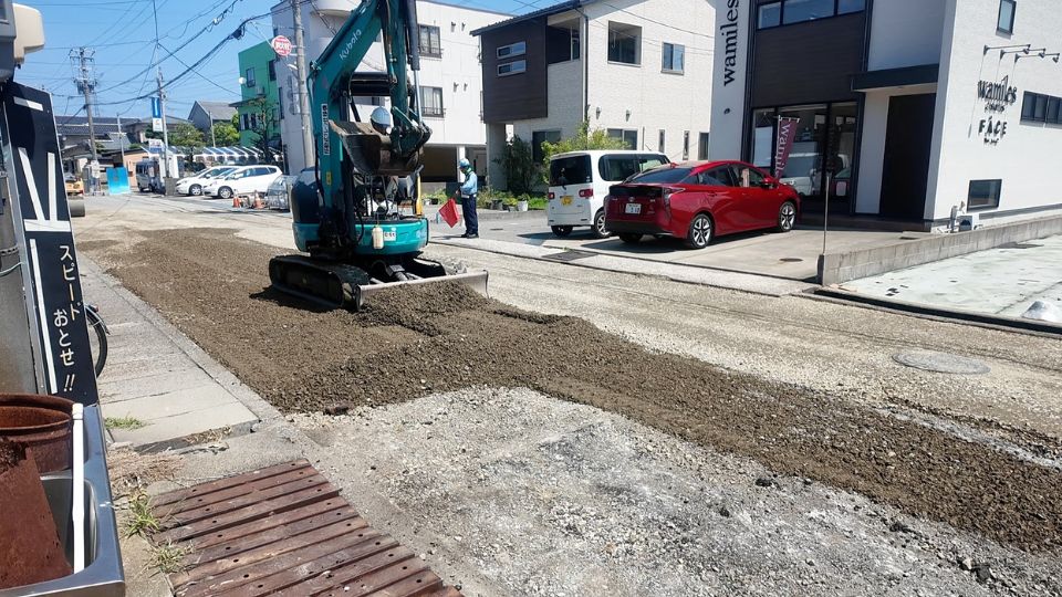現場に到着したら、まず安全確認。隣接する駐車場の車の状況や、実際の交通量などを自分の目で確かめます。準備が整ったら、バックホウなどの重機を使い、古いアスファルトをパワフルに撤去。重機のオペレーター、誘導員、そして資材を運ぶダンプの運転手。全員の息を合わせたチームプレイで、作業はテンポよく進んでいきます。