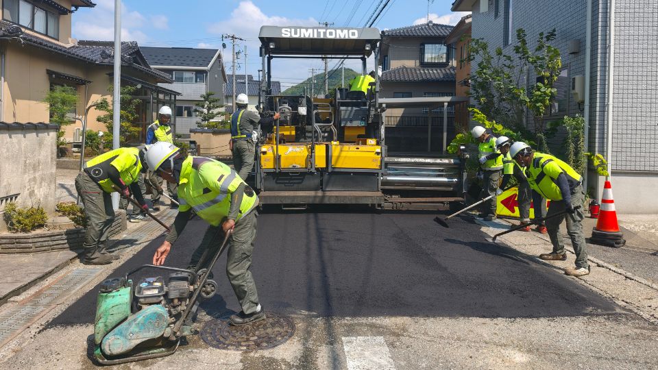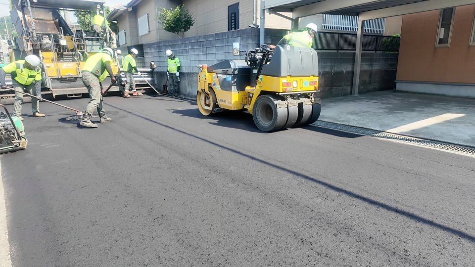 古い舗装を剥がした下地を、平らに締め固める「路盤整正」。一見地味な作業ですが、このひと手間が道路の強度や水はけを決め、最終的な仕上がりを大きく左右します。ミリ単位の精度が求められる、まさに職人の腕の見せ所です。